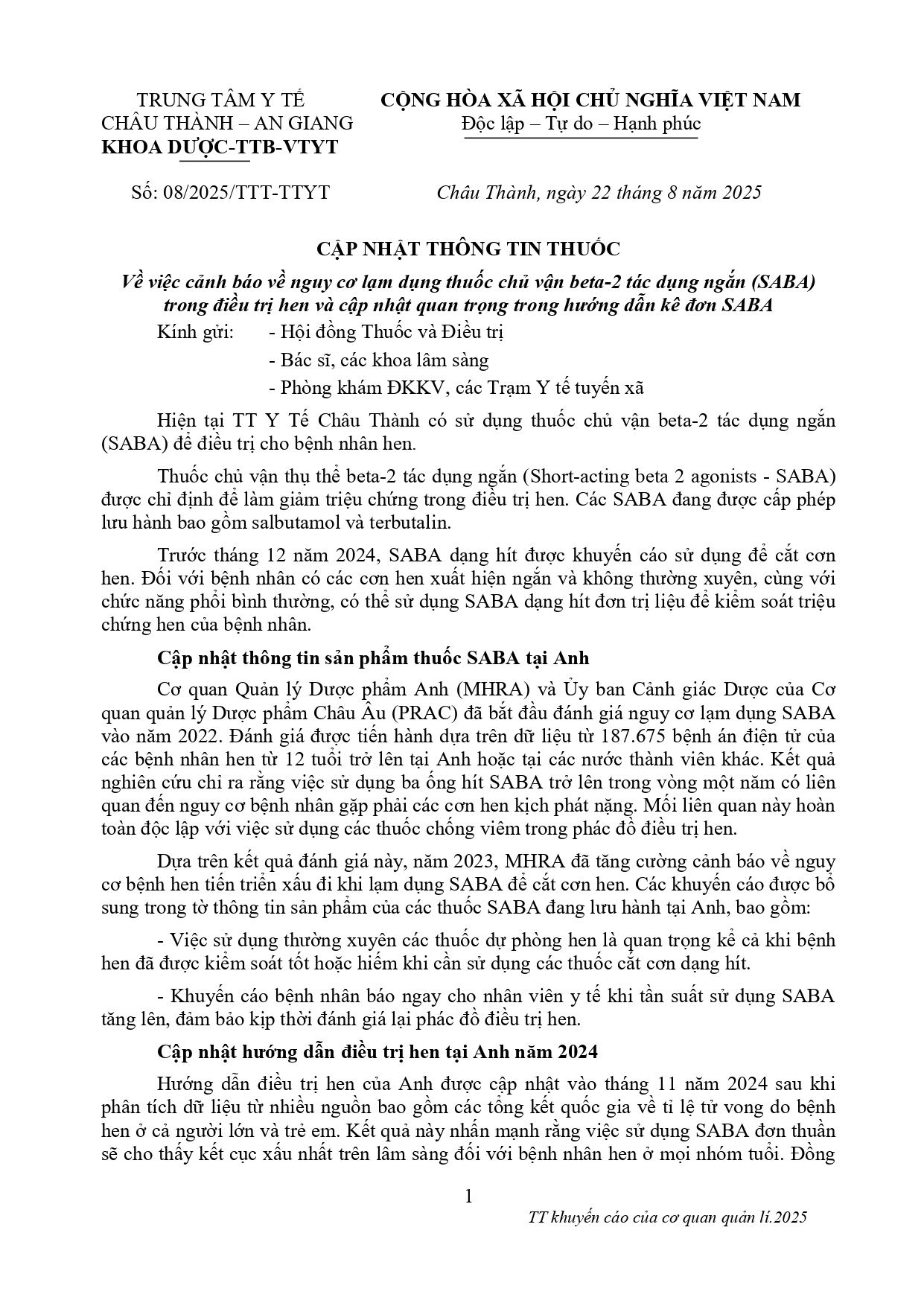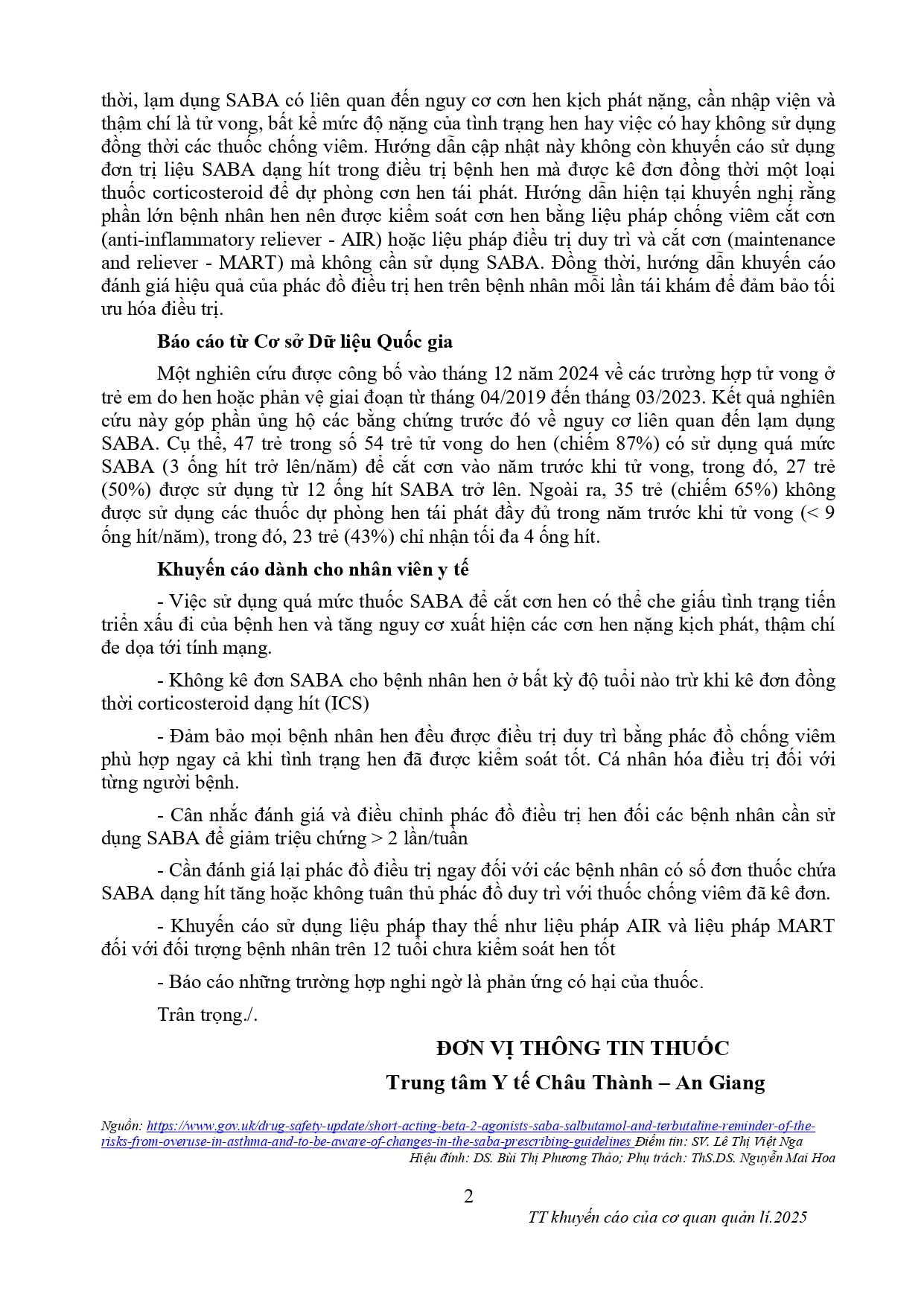 CẬP NHẬT THÔNG TIN THUỐC Về việc cảnh báo về nguy cơ lạm dụng thuốc chủ vận beta-2 tác dụng ngắn (SABA) trong điều trị hen và cập nhật quan trọng trong hướng dẫn kê đơn SABA