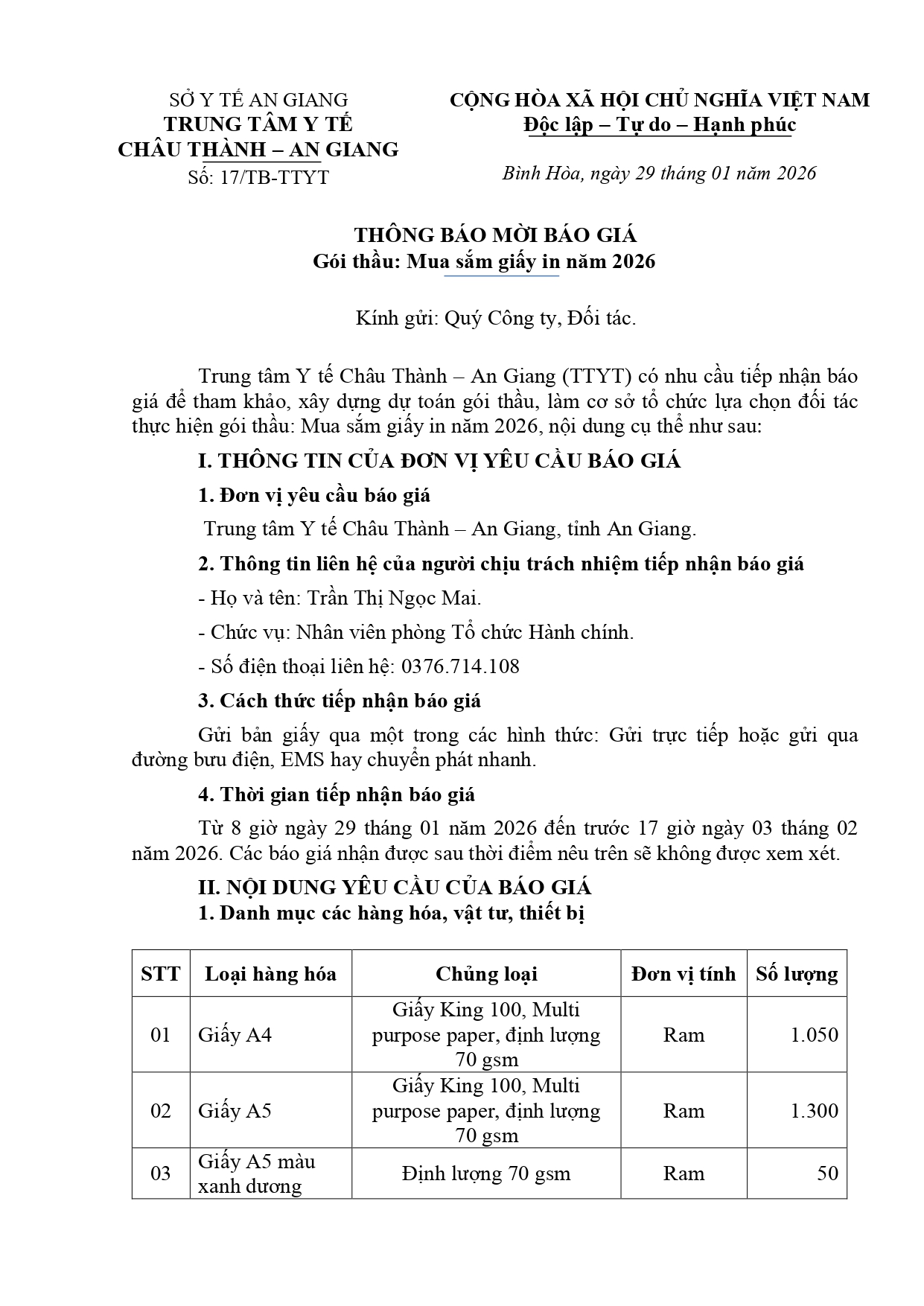 THÔNG BÁO MỜI BÁO GIÁ Gói thầu: Mua sắm giấy in năm 2026 Ngày đăng: 30/01/2026 - 07:34 Chia sẻ: | In bài viết
