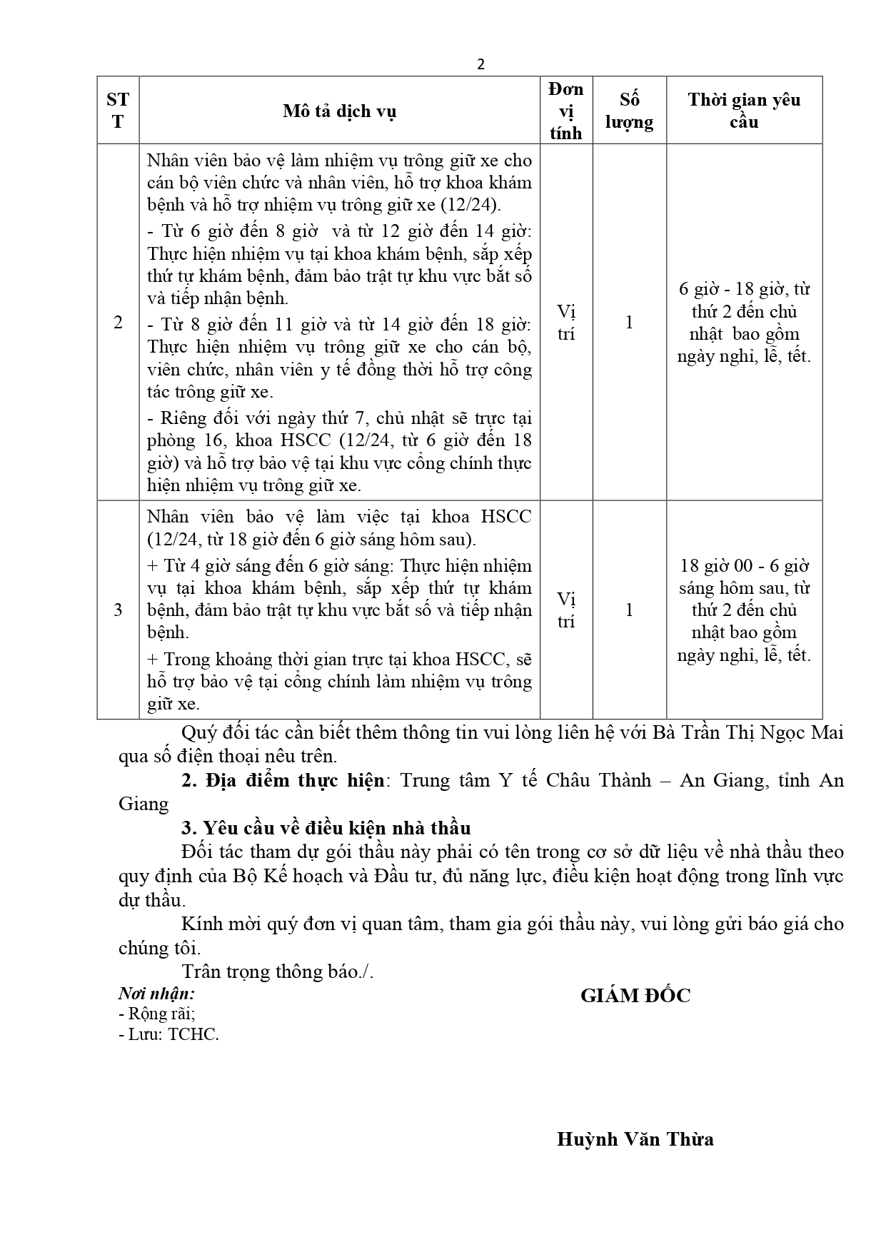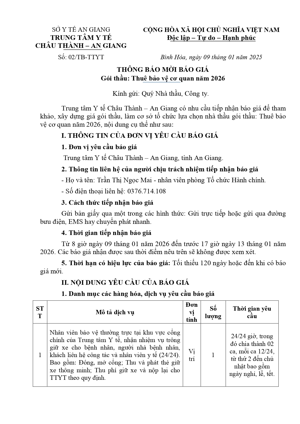 THÔNG BÁO MỜI BÁO GIÁ Gói thầu: Thuê bảo vệ cơ quan năm 2026 Ngày đăng: 12/01/2026 - 13:21 Chia sẻ: | In bài viết