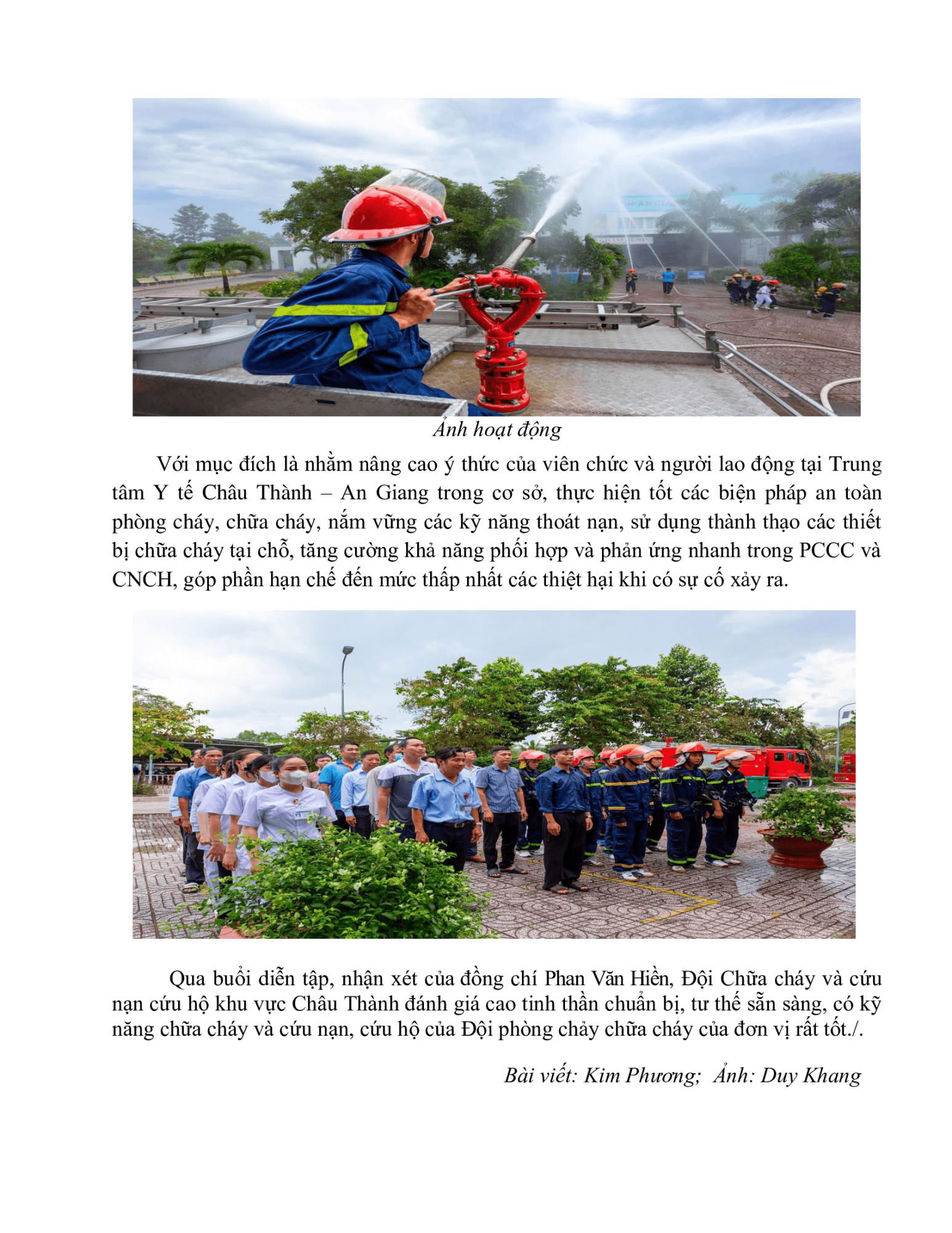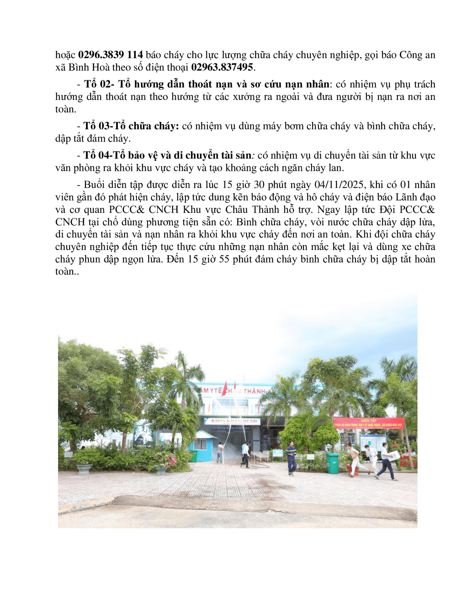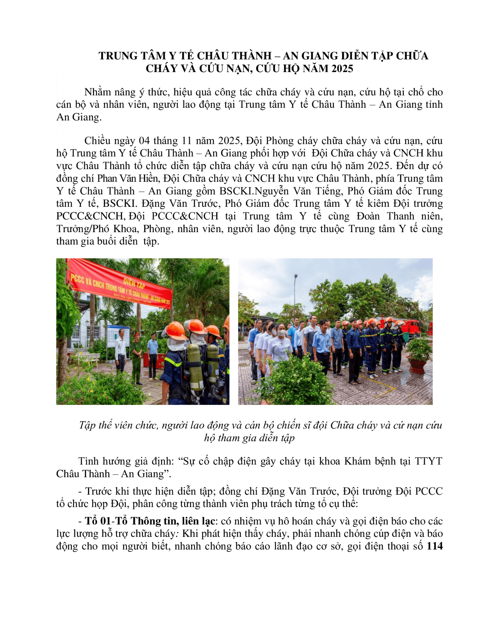 TRUNG TÂM Y TẾ CHÂU THÀNH – AN GIANG DIỄN TẬP CHỮA CHÁY VÀ CỨU NẠN, CỨU HỘ NĂM 2025 Ngày đăng: 06/11/2025 - 14:02 Chia sẻ: | In bài viết